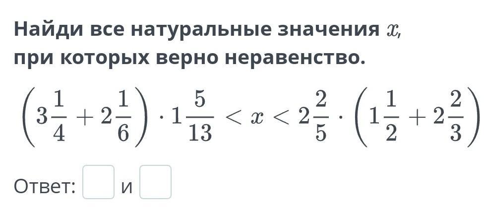 Найди все натуральные значения x, при которых верно неравенство. (3 1/4+ 2 1/6)*1 5/13 < х < 2 2/5*(1 1/2 + 2 2/3)