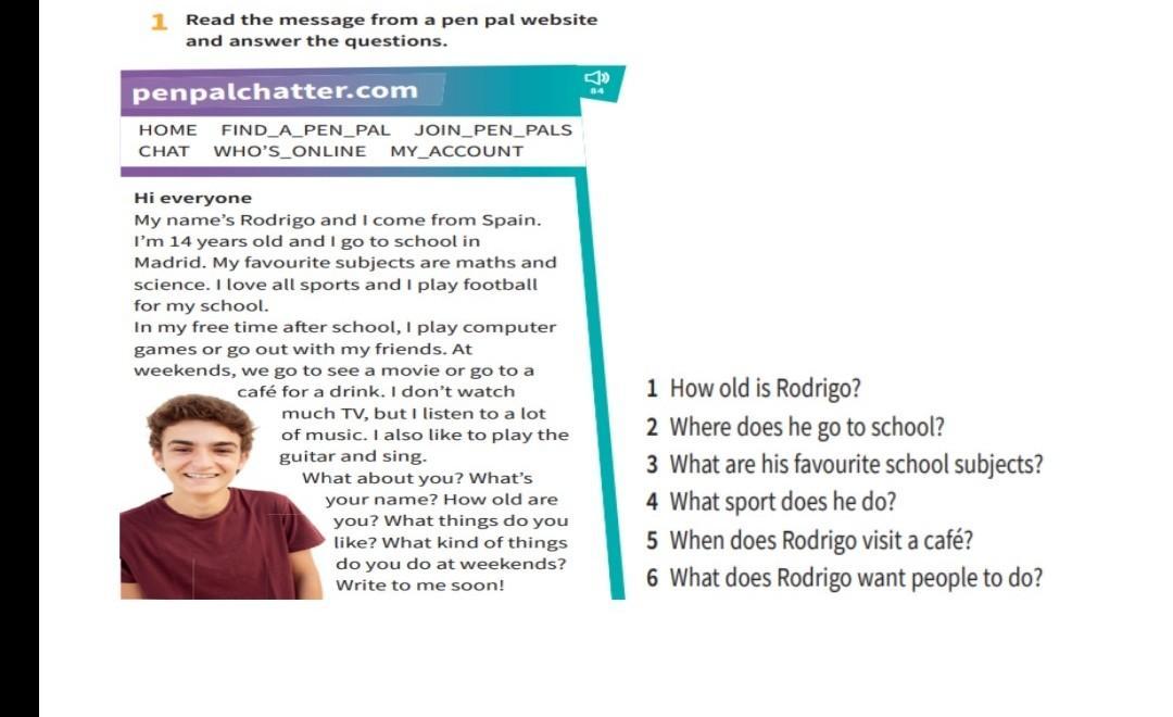 1 Read the message from a pen pal website and answer the questions. penpalchatter.com HOME FIND_A_PEN_PAL CHAT WHO'S ONLINE MY ACCOUNT JOIN PEN_PALS Hi everyone My name's Rodrigo and I come from Spain. I'm 14 years old and I go to school in Madrid. My favourite subjects are maths and science. I love all sports and I play football for my school. In my free time after school, I play computer games or go out with my friends. At weekends, we go to see a movie or go to a café for a drink. I don't watch much TV, but I listen to a lot of music. I also like to play the guitar and sing. What about you? What's your name? How old are you? What things do you like? What kind of things do you do at weekends? Write to me soon! 4 84 1 How old is Rodrigo? 2 Where does he go to school? 3 What are his favourite school subjects? 4 What sport does he do? 5 When does Rodrigo visit a café? 6 What does Rodrigo want people to do?