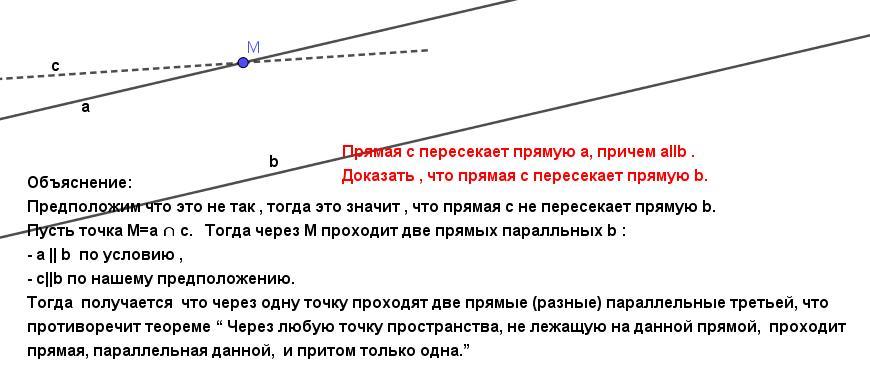 Предположим что это не так , тогда это значит , что прямая с не пересекает прямую b.