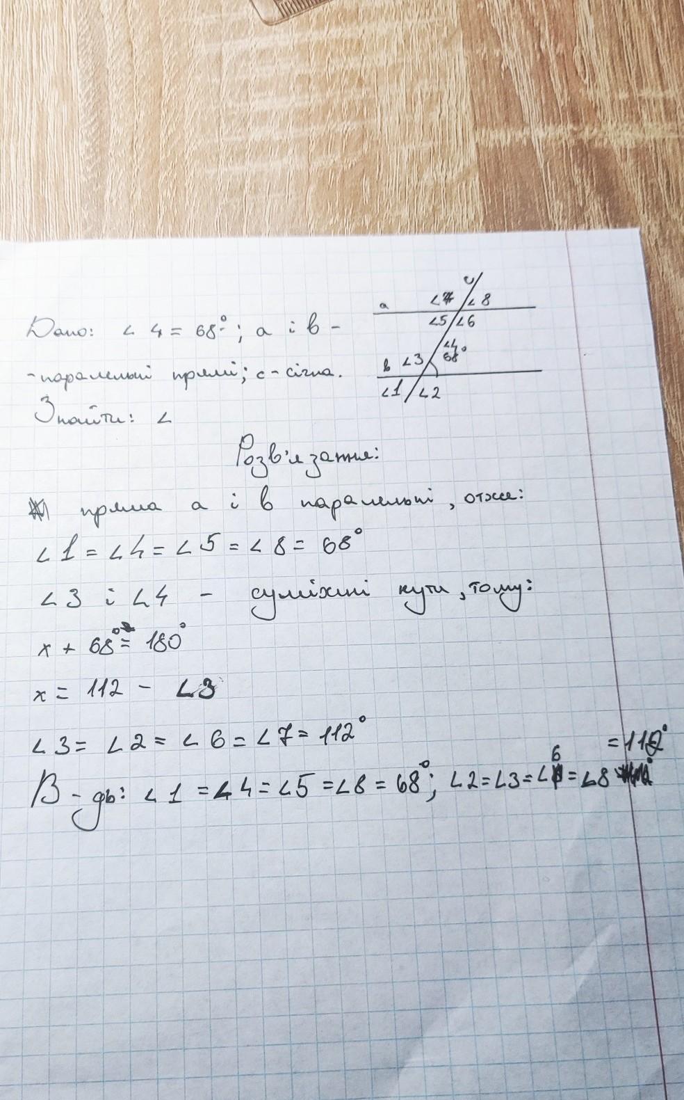 3º. Один з кутів, що утворилися ні двох паралельних прямих сiчною, дорів- нює 68°. Знайдіть градусні міри решти семи кутів. сумiжнi кути, якщо один з них ДАЮ 50 БАЛИВ СРОЧНО