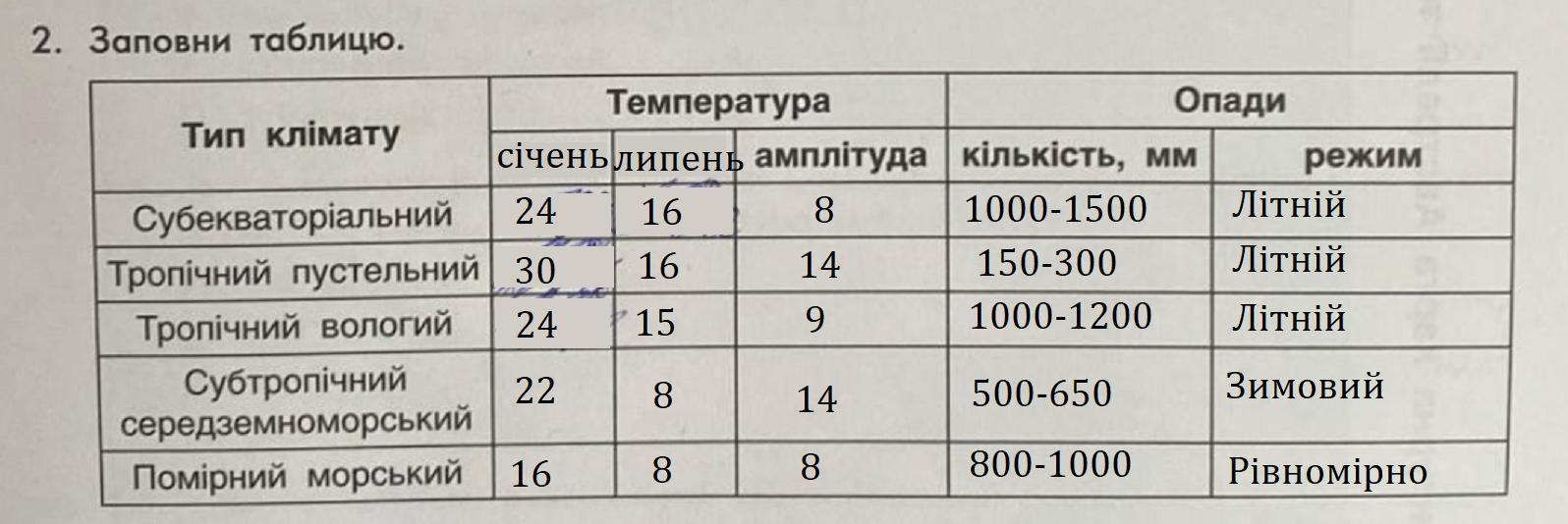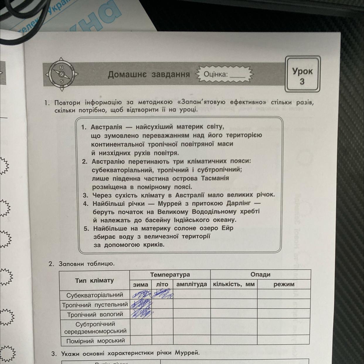 - Заповнена таблиця "Тип клімату Австралії" дана нижче у додатку.