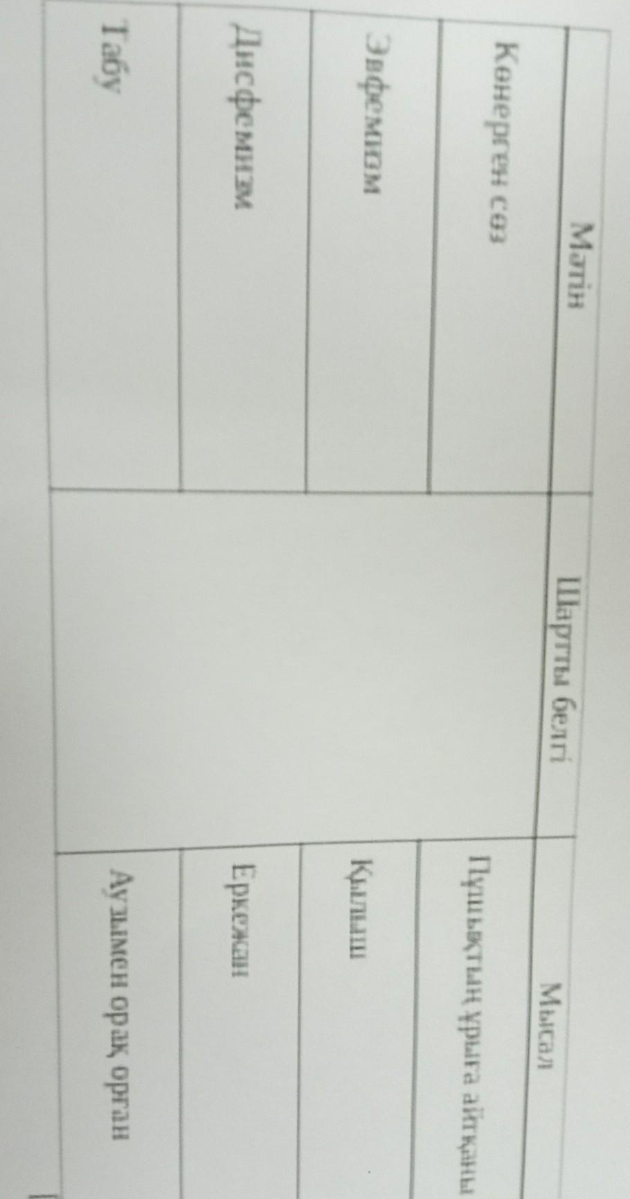 Көнерген сөз Эвфемизм Дисфемизм Мәтiн Табу Шартты белгi Пушықтың ұрыға айтқаны Қылыш Мысал Еркежан Аузымен орак орган [4]