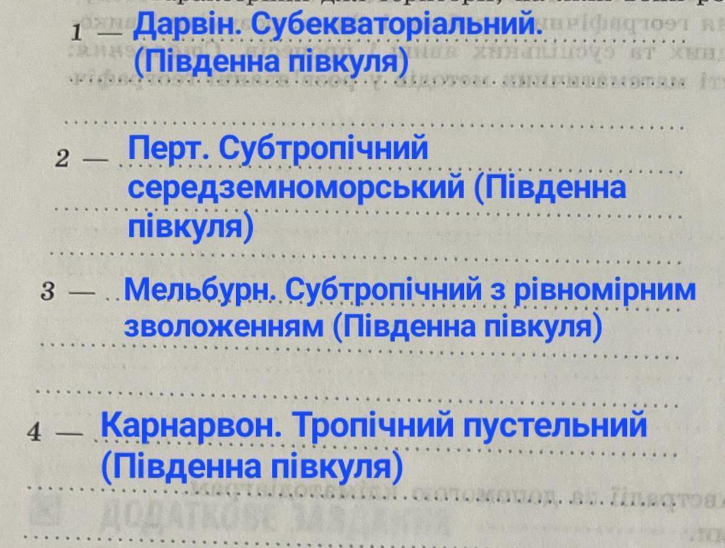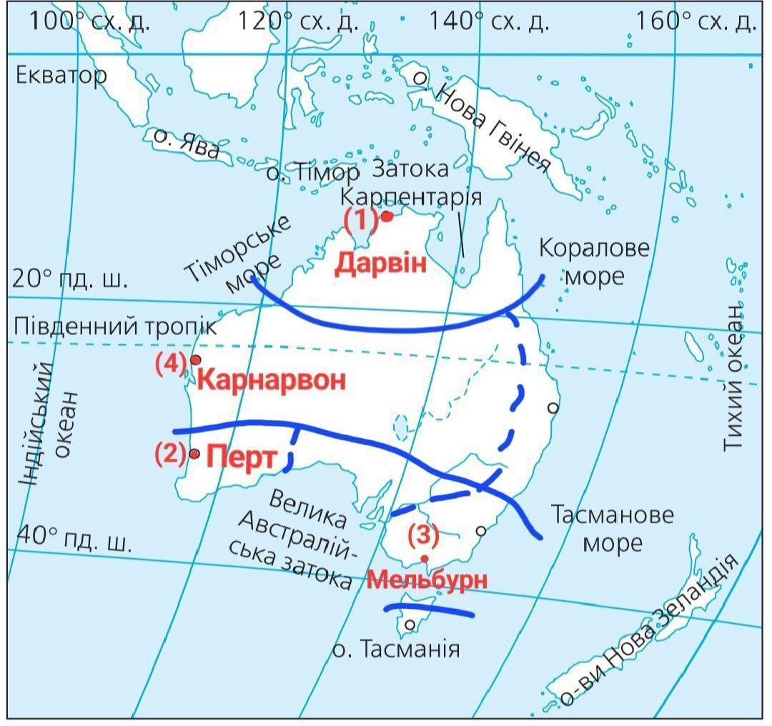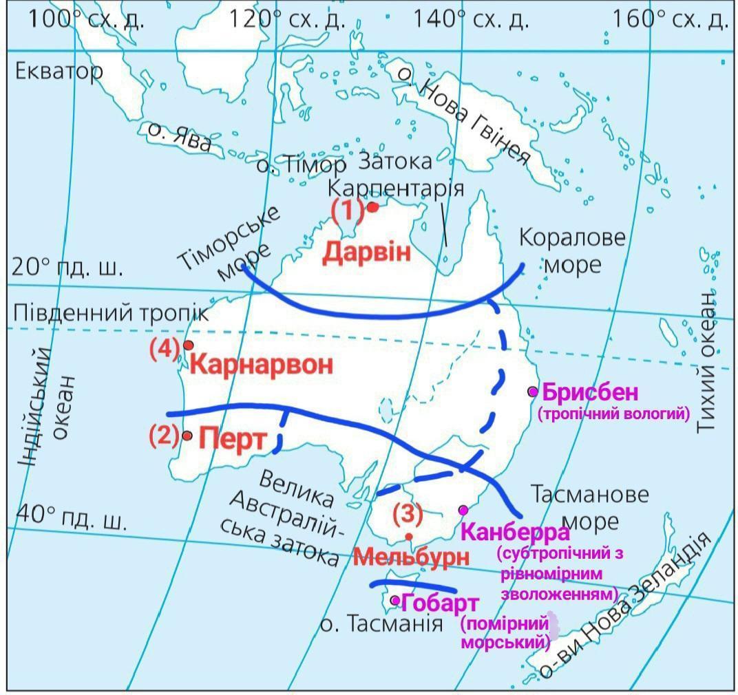 28 Проведіть на картосхемі «Австралія» межі кліматичних поясів та областей материка. Ви- значте розташування міст (позначені пунсонами у вигляді кружечків), клімат яких відо- бражено за допомогою кліматодіаграм (зверніть увагу на те, що міст на два більше). Під- пишіть на картосхемі їхні назви. Укажіть тип клімату (за необхідністю півкулю) оз характерний для території, на якій вони розташовані. пона 3. 100° сх. д. Екватор Андiйський океан 20° пд. ш. Південний тропік 40° пп о. Ява III 120° сх. Тiморське море ПРАКТИЧНІ РОБОТИ Велика Австралі 1409 сх. д. «Тíмор Затока Карпентарія Нова Гвінея 160° сх. Коралове море Тасманов море