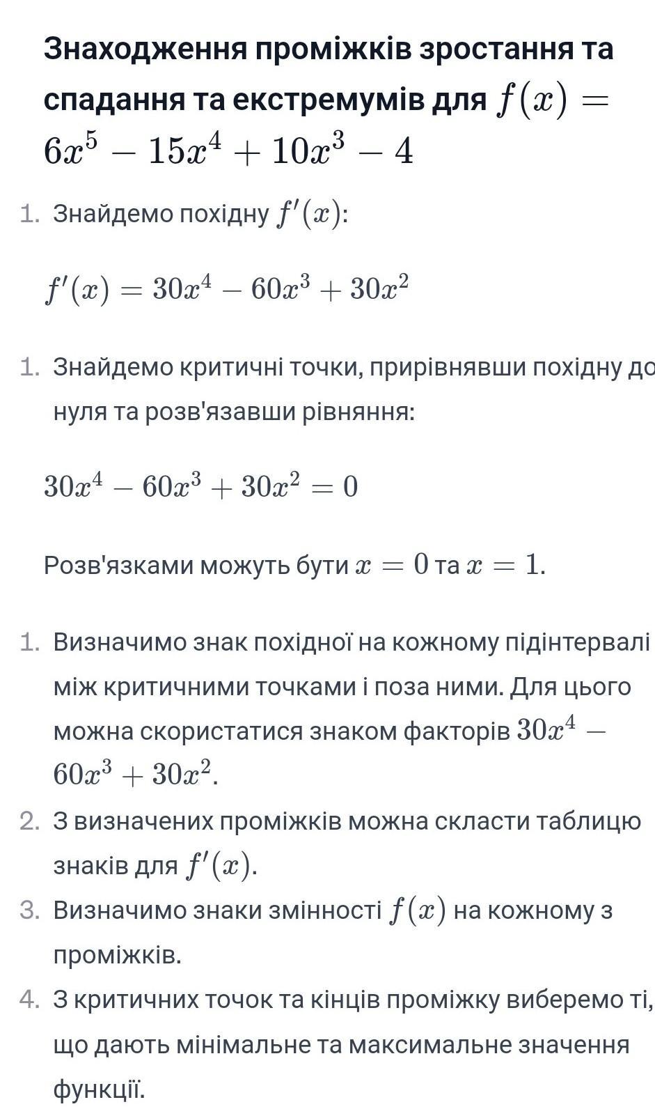 2. Знайти проміжки зростання та спадання та екстремуми функції f(x)=6x^(5)-15x^(4)+10x^(3)-4