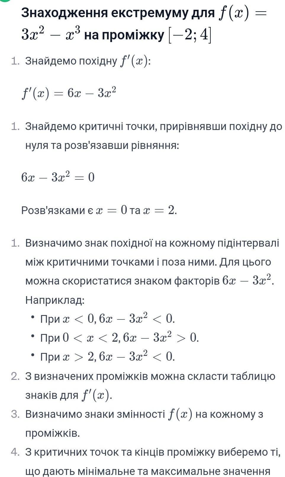 ### Знаходження екстремуму для \(f(x) = 3x^2 - x^3\) на проміжку \([-2; 4]\)