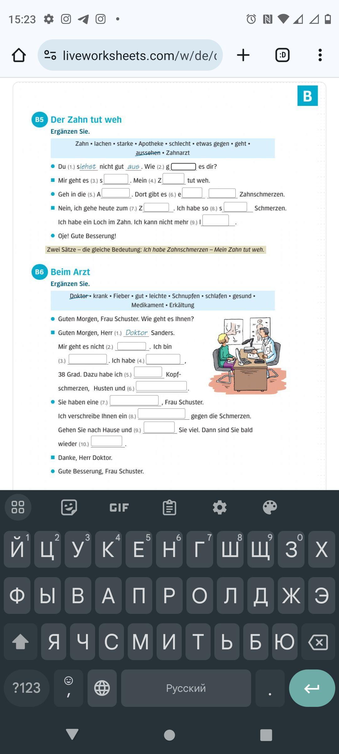 Mir geht es nicht gut. Ich bin krank. Ich habe Fieber 38 Grad. Dazu habe ich leichte Kopfschmerzen, Husten und Schnupfen.