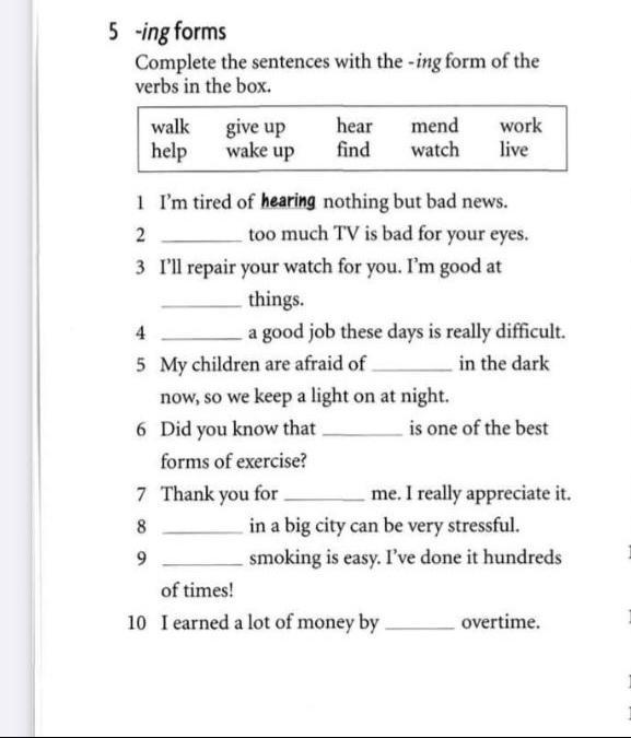 2 watching 3 mending 4 finding 5 waking up 6 walking 7 helping 8 living 9 giving up 10 working ...