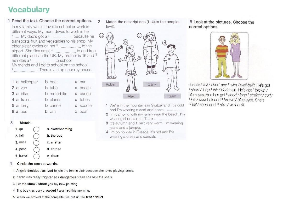5. Jake is short and well-built. He's got short dark hair. He's got brown eyes. Ana has long curly fair hair and brown/blue eyes. She's tall and slim.
