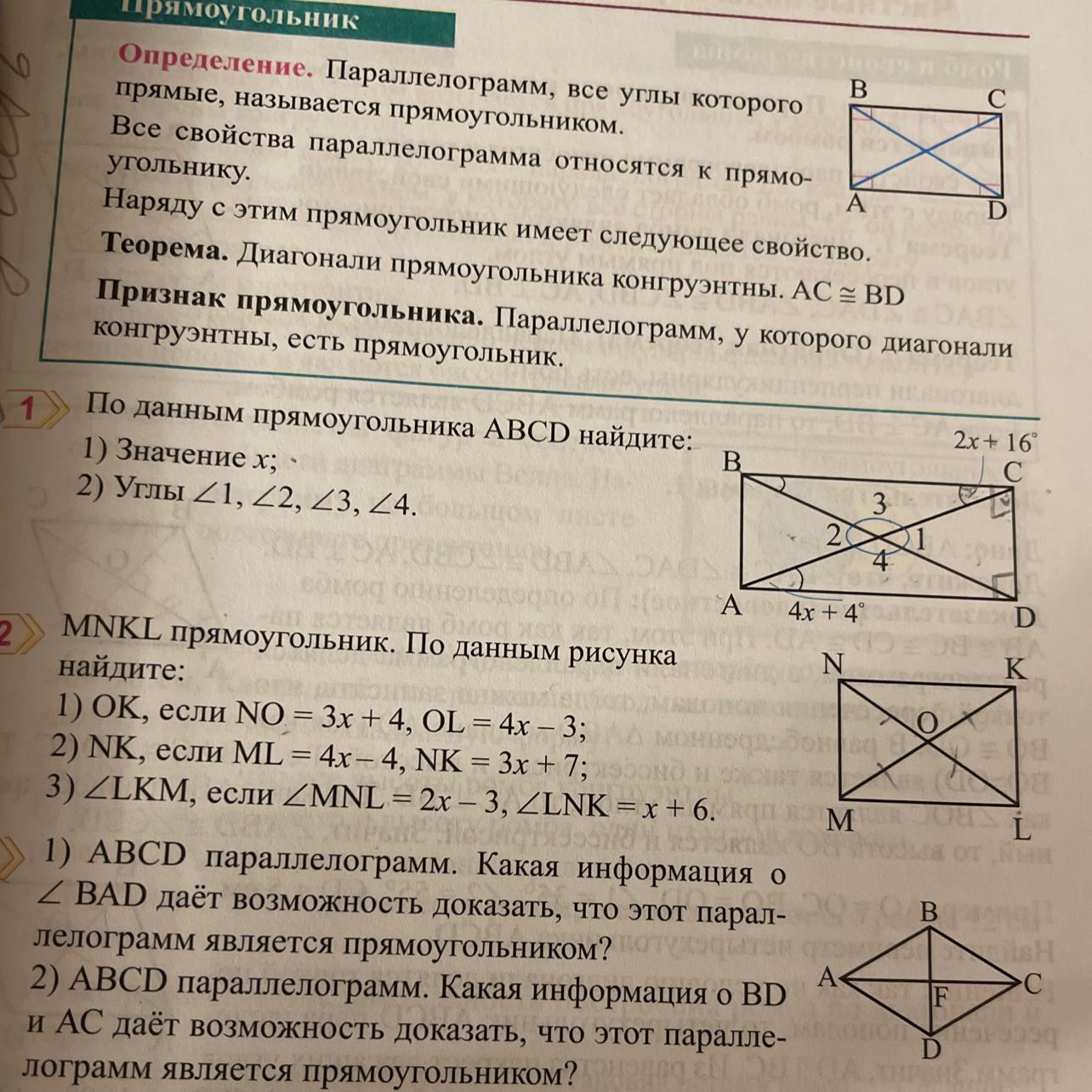 1)МNKL прямоугольник по условию и его диагонали равны , значит NO=OL=4x-3=3x+4