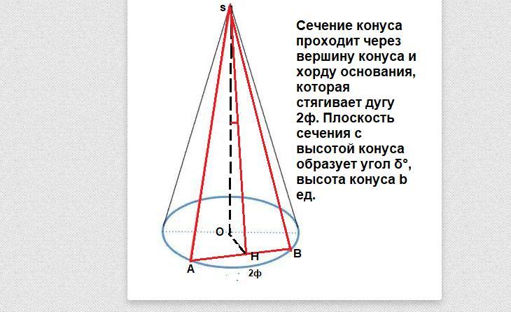 1. Проведений переріз конуса через вершину конуса і хорду основи, яка стягує дугу 2ϕ°. Площина перерізу з висотою конуса утворює кут ω°, висота конуса m од.вим.