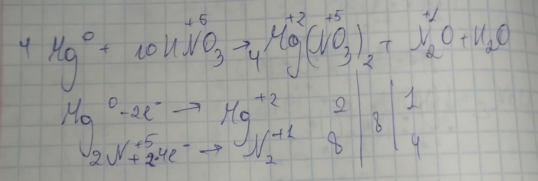 Mg + HNO3(розв.) → Mg(NO3)2 + N2O↑ + H2O