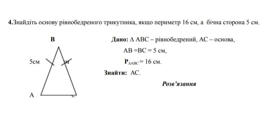 4.Знайдіть основу рівнобедреного трикутника, якщо периметр 16 см, а бічна сторона 5 см. Дано: ∆ ABC – рівнобедрений, АС - основа, AB =BC = 5 см, Рдавс = 16 см. 5cm A B Знайти: AC. Розв'язання