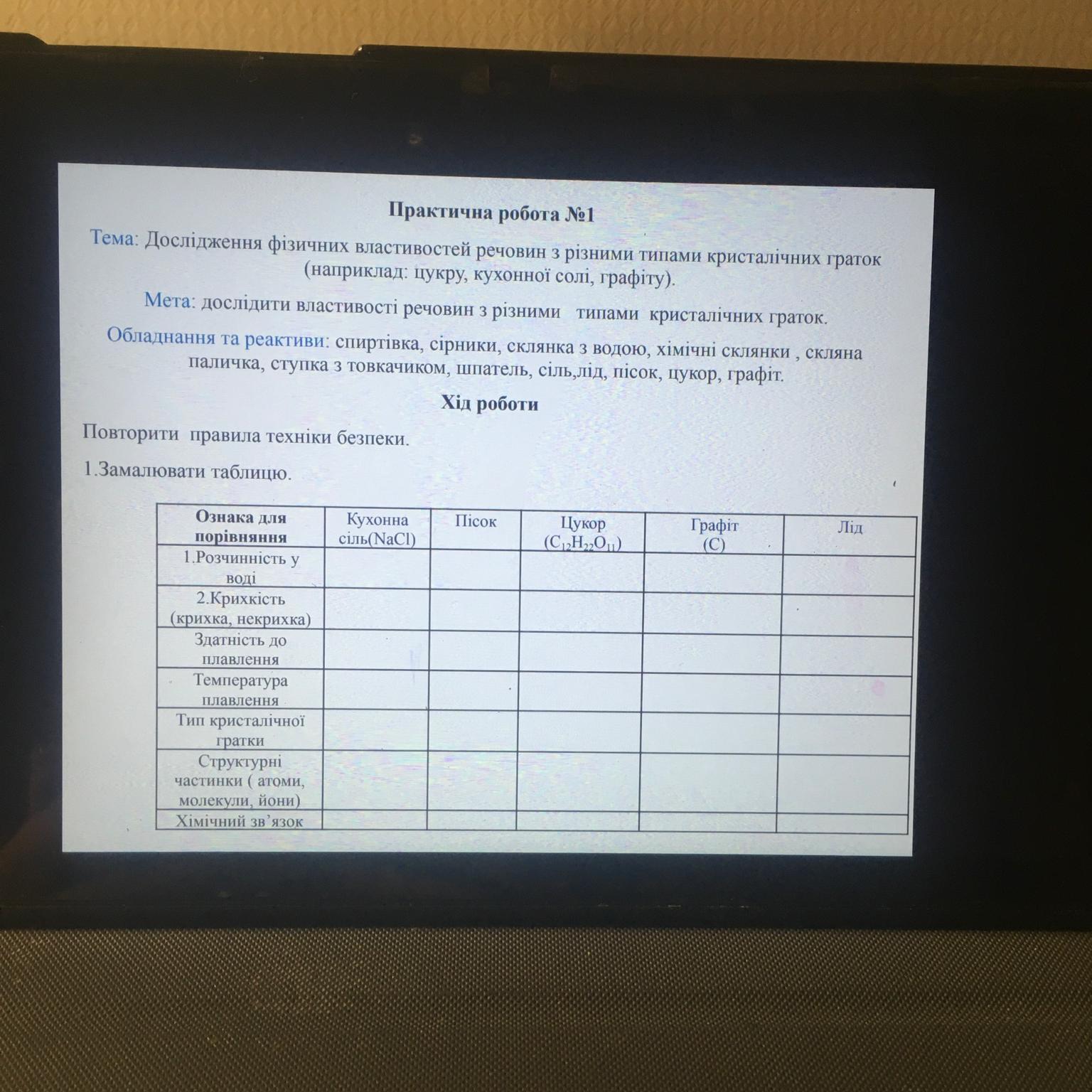 3. Заповніть таблицю речовинами, які вивчатимете: кухонною сіллю (NaCl), піском, цукром (C12H22O11), графітом (C).