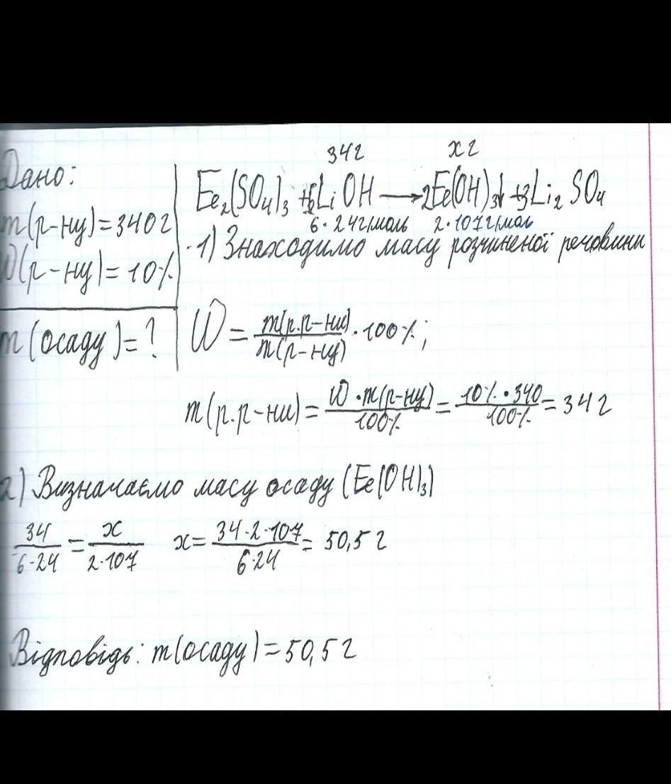 2. Яка маса осаду утвориться в результаті взаємодії розчину ферум(ІІІ) сульфату із 340 г 10 % розчину літій гідроксиду?