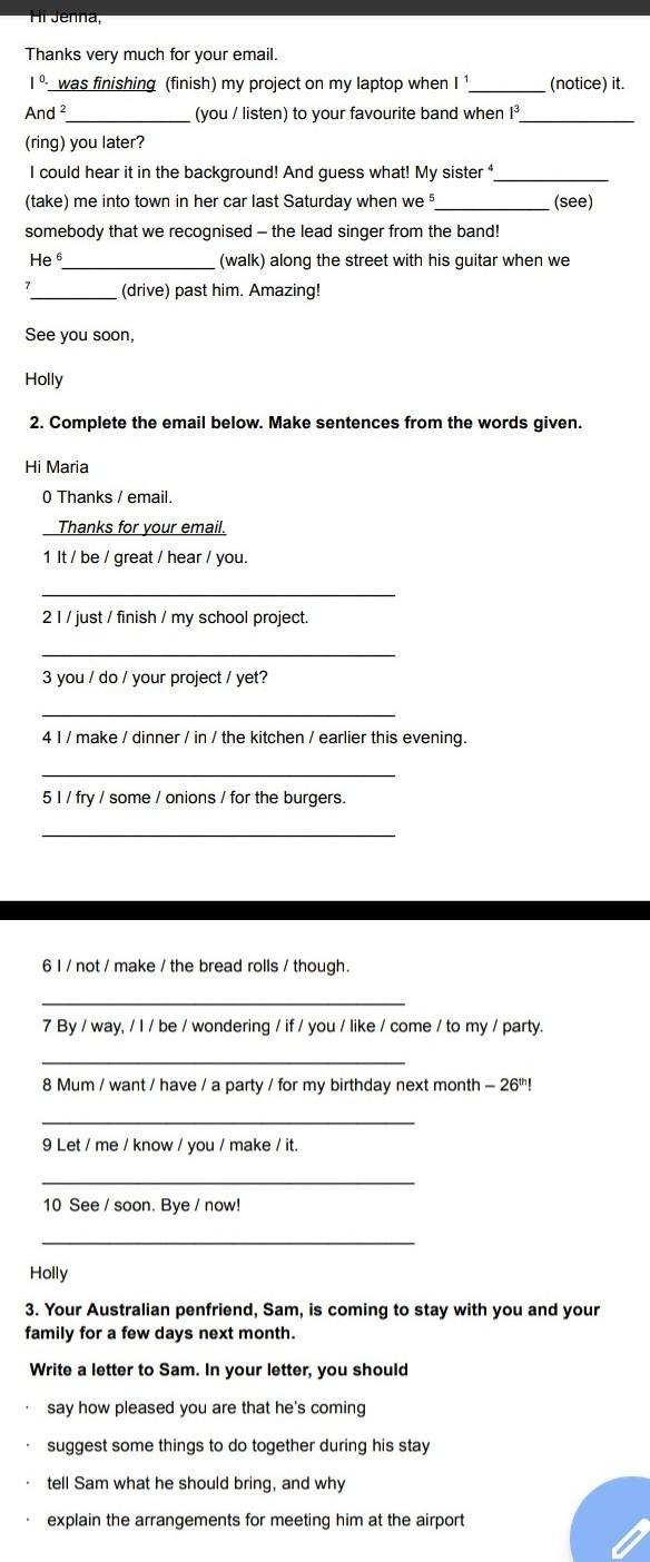 Відповідь:1)Hi Jenna, Thanks very much for your email. I **was finishing** my project on my laptop when I **rang** you later? I could hear it in the background! And guess what! My sister **took** me into town in her car last Saturday when we **saw** somebody that we recognized - the lead singer from the band! He **was walking** along the street with his guitar when we **noticed** it. **Were you listening** to your favorite band when I drove past him? Amazing! See you soon, Holly.2)