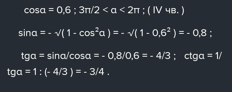 sina=√1-cos^2 a= -0.8(мінус, тому що знаходиться в четвертій четверті)
