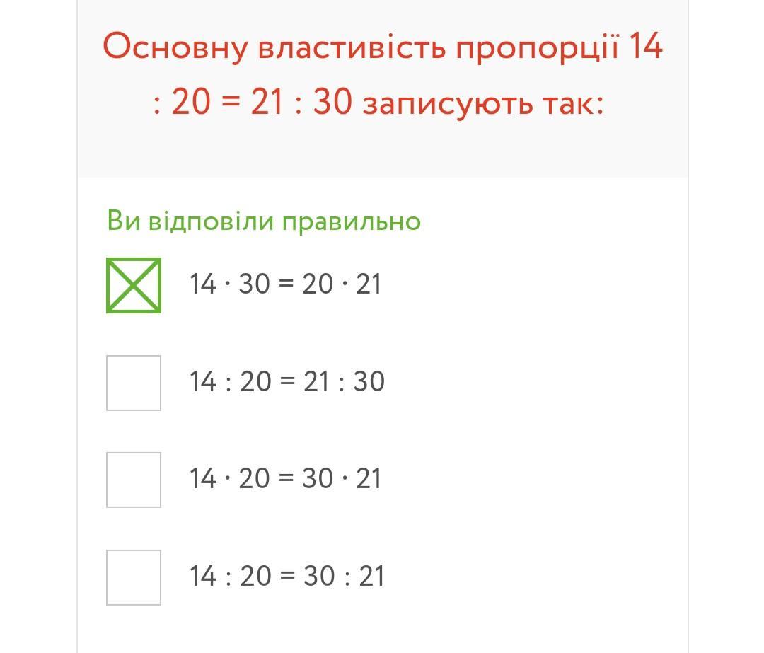 2) Основное свойство пропорции 14 : 20 = 21 : 30 записывают так: