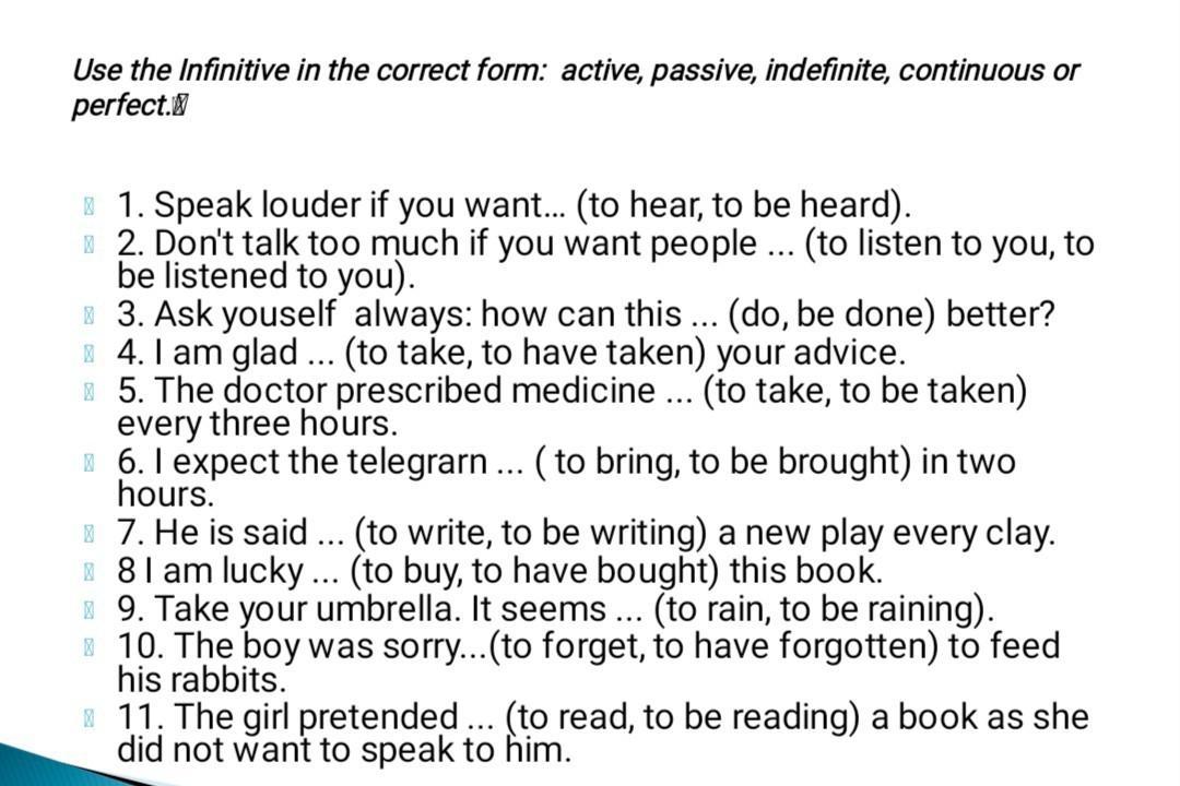 Use the Infinitive in the correct form: active, passive, indefinite, continuous or perfect.