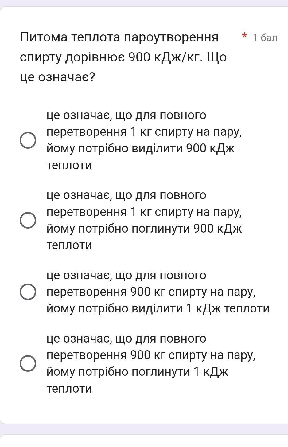 Це означає, що для повного перетворення 1 кг спирту на пару йому потрібно виділити 900 кДж теплоти. Відповідь: бал.