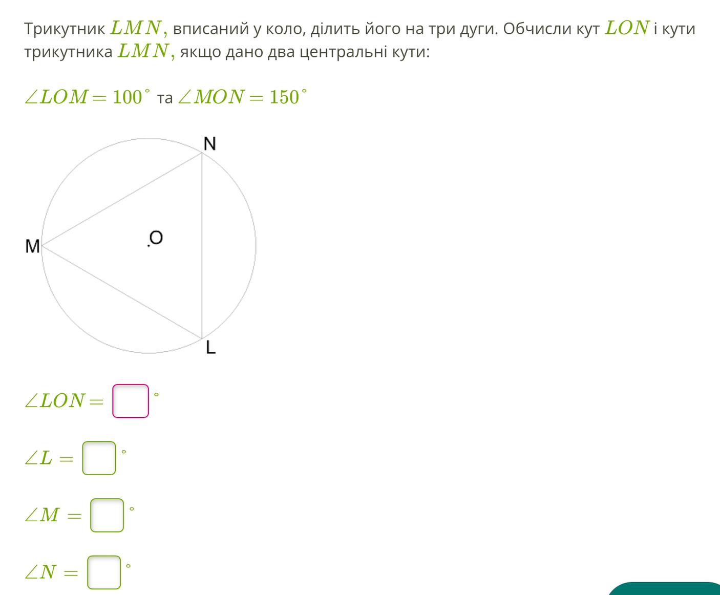 ∪ LM=∠LOM=100°; ∪ MN=∠MON=150°; ∪ NL=360-100-150=110°