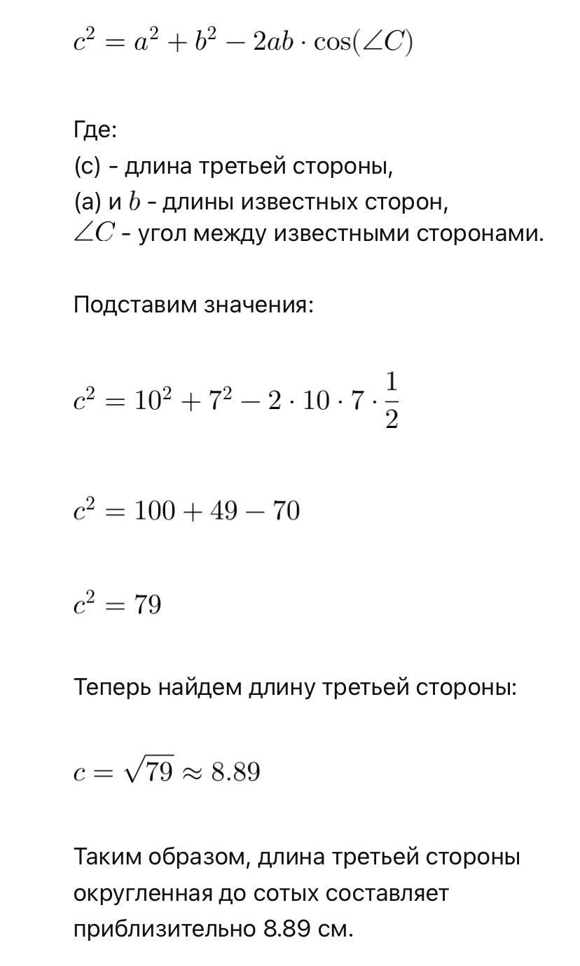 Пусть стороны треугольника a и b, угол между ними С, неизвестная сторона с.