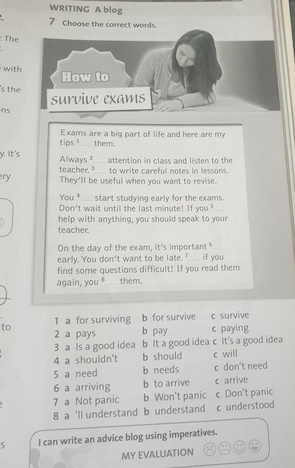 't, y. The 3- e with 's the ons y. It's ery WRITING A blog 7 Choose the correct words. How to survive examS Exams are a big part of life and here are my tips them. Always attention in class and listen to the teacher. 3 to write careful notes in lessons. They'll be useful when you want to revise. You 4 start studying early for the exams. Don't wait until the last minute! If you help with anything, you should speak to your teacher. 5 On the day of the exam, it's important early. You don't want to be late. 7. if you find some questions difficult! If you read them again, you 8 them. 1 a for surviving 2 a pays 3 a Is a good idea 4 a shouldn't 5 a need 6 a arriving 7 a Not panic 'll understand 6 r b for survive c survive b pay c paying b It a good idea c It's a good idea b should c will b needs c don't need c arrive b to arrive c Don't panic b Won't panic b understand c understood