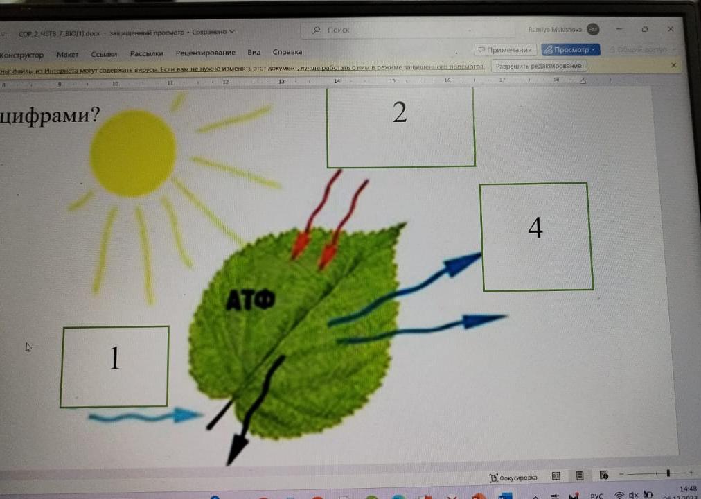1 - вдох воздуха. 2 - получение солнечного света и тепла. 4 - выдых кислорода