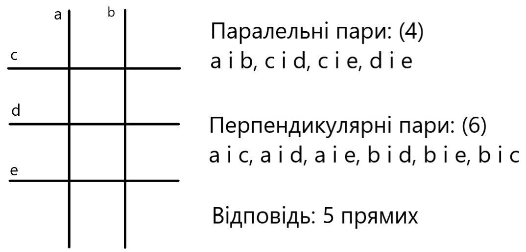 Яку найменшу кількієть прямих треба нарисувати, щоб серед них можна було вибрати принаймні 4 пари паралельних та принаймні 6 пар перпендикулярних прямих. Нагадаємо, що 2 пари прямих різні, якщо вони відрізняються хоча б однією з прямих, тобто пари прямих (а, b) та (а, с) - різні, а пари прямих (а, b) та (b, a) - однакові