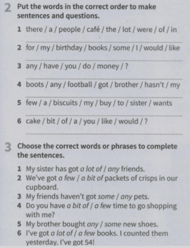 Ответ:1 there the cafe were a lot of people in 2 i would like some books for my birthday 3 do you have any money? 4 my brother hasn"t dot any football boots 5 my sister wants to buy a few biscuits 6 would you like a bit of cake?