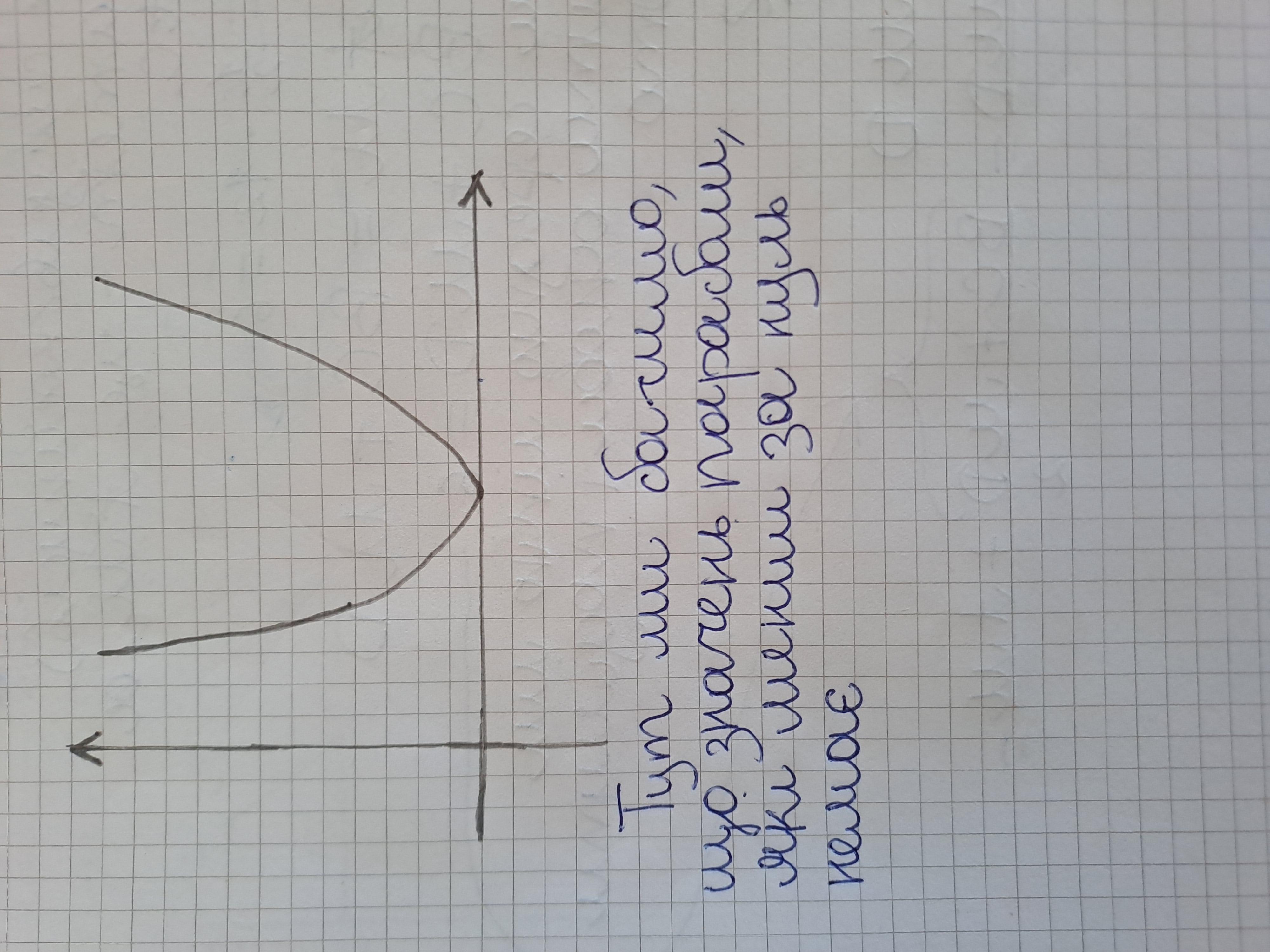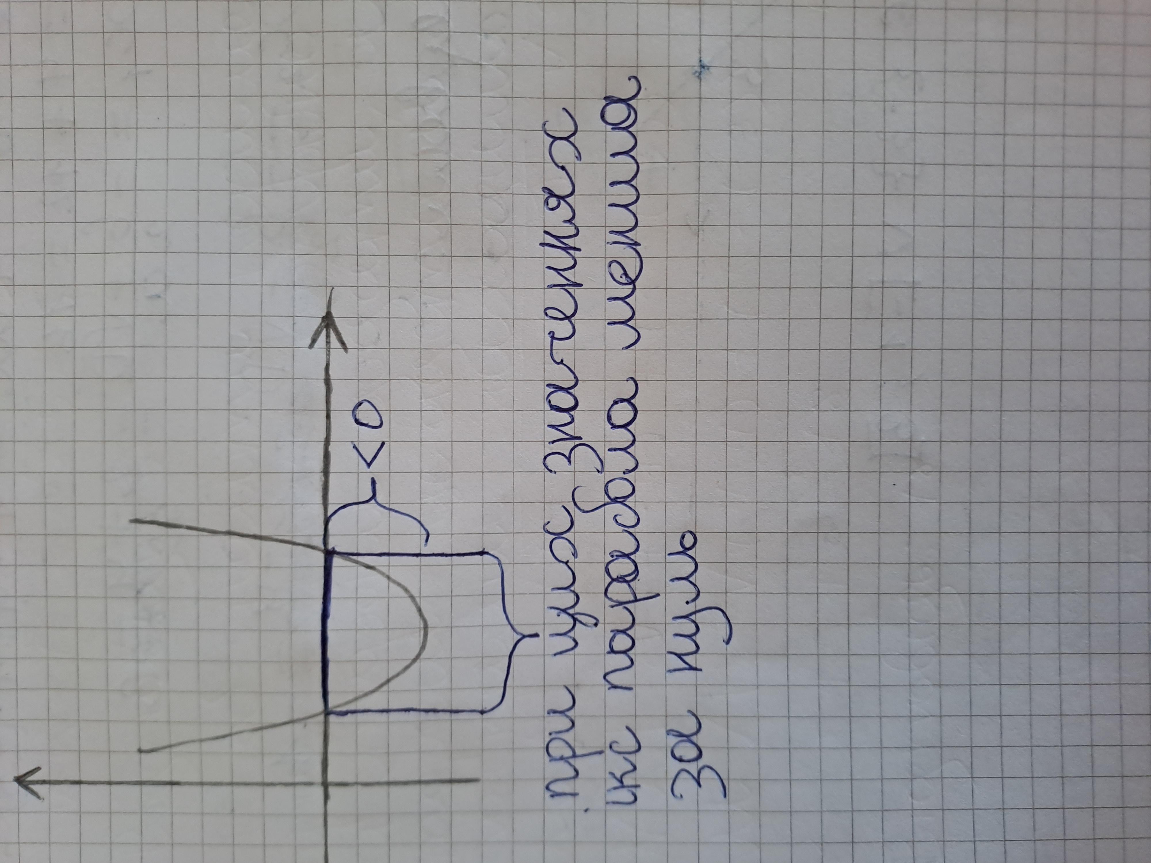 , тому ми розуміємо, що наш графік - парабола, напрямлена вітками вгору. "<0" означає, що розв'язком цього рівняння будуть значення x, при яких парабола менша за 0 (як на першому прикріпленому зображенні. Але нам потрібно, щоб це рівняння не мало розв'язків. Воно не буде мати розв'язків, якщо графік параболи не буде менший за нуль (як в другому прикріпленому зображенні), адже якщо ми шукаємо ікси, при яких парабола менша за нуль, а вона не буде меншою за нуль при будь яких іксах, то і шукати не буде чого. Одже зараз наша задача - зробити так, щоб парабола не була менша за нуль. Це можливо, якщо її вершина (вершина параболи позначається