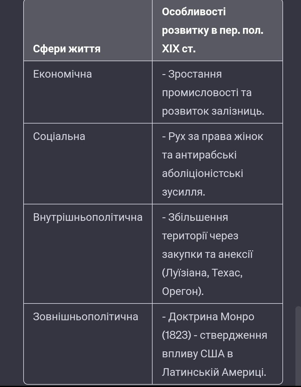 Складіть таблицю «Особливості розвитку США в пер. пол. XIX ст.»