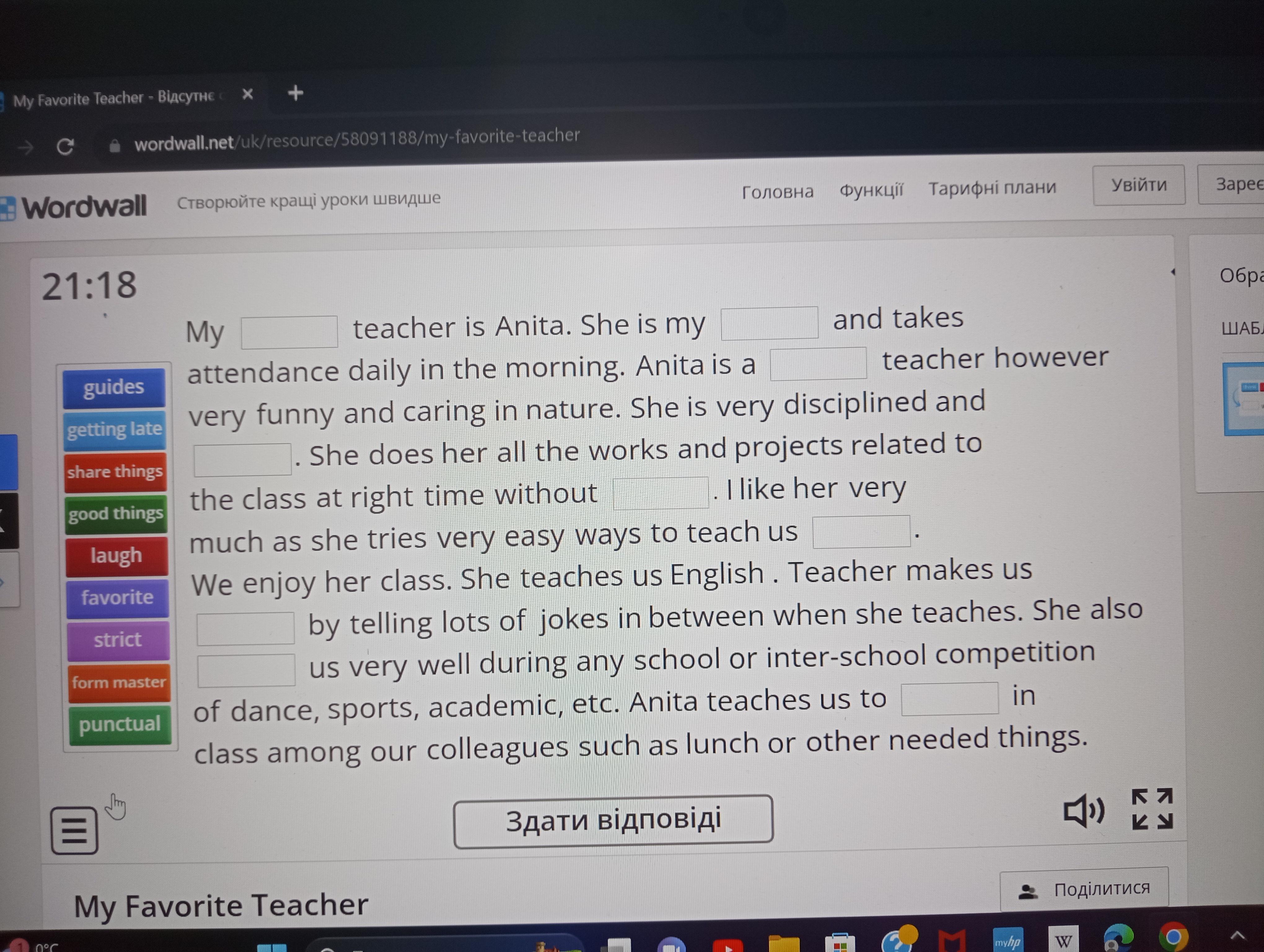 1 favourite 2 form master 3 strict 4 punctual 5 getting late 6 good things 7 laugh 8 guides 9 share things......
