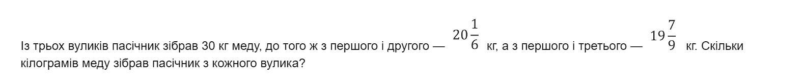 Також умова дає нам інші два рівняння, одне стосовно збору меду з першого і другого вулика \(x + y =20 1/6) і інше - з першого і третього (x + z = 19 7/9)).