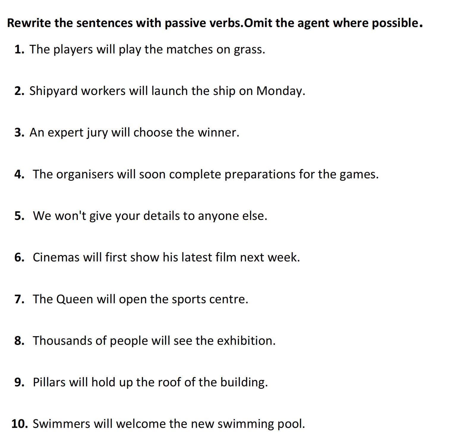 Rewrite the sentences with passive verbs.Omit the agent where possible.