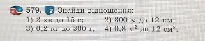 579. Знайди відношення: 1) 2 хв до 15 с; 3) 0,2 кг до 300 г; 2) 300 м до 12 км; 4) 0,8 м² до 12 см².