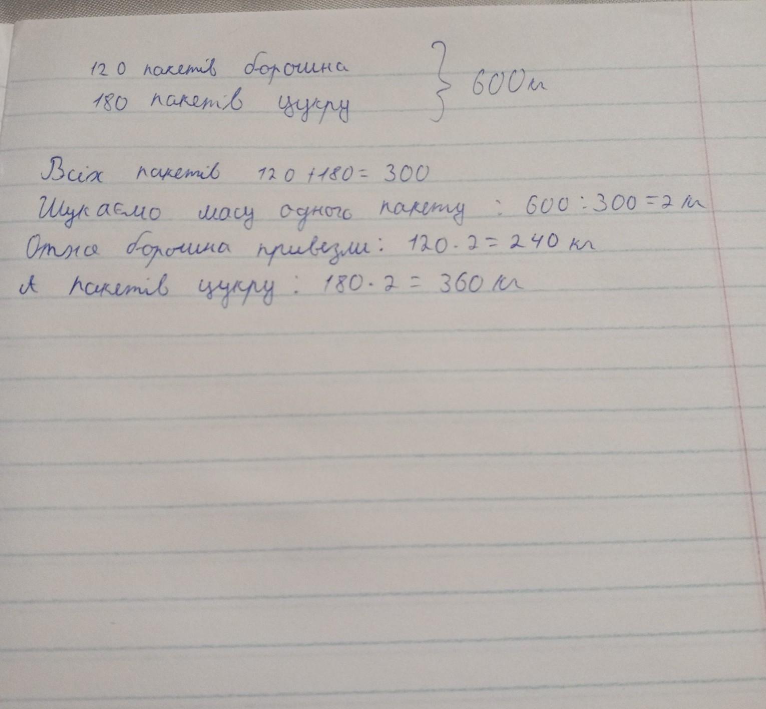 До магазину привезли 120 пакетів борошна та 180 пакетів цукру загальною масою 600 кг скільки привезли цукру та борошна окремо, якщо маса пакетів однакова?