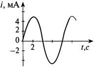 На рисунку зображений графік залежності сили струму від часу в коливальному контурі. Чому дорівнюють значення амплітуди і частоти коливань сили струму
