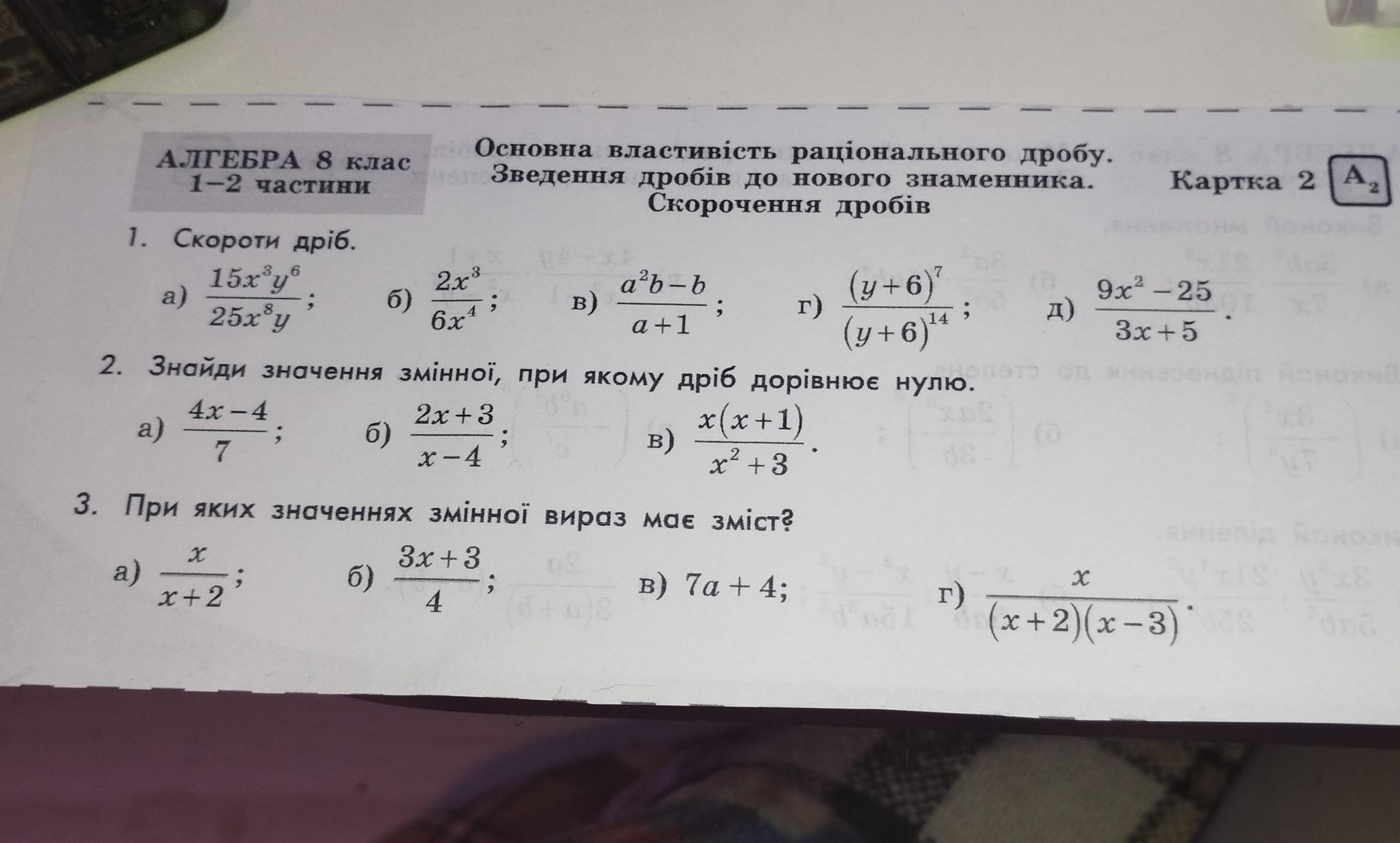 1 . a) ( 15x³y⁶ )/( 25x⁸y ) = ( 3y⁵ )/( 5x⁵ ) ; б) 2х³/( 6x⁴ ) = 1/( 3x ) ;