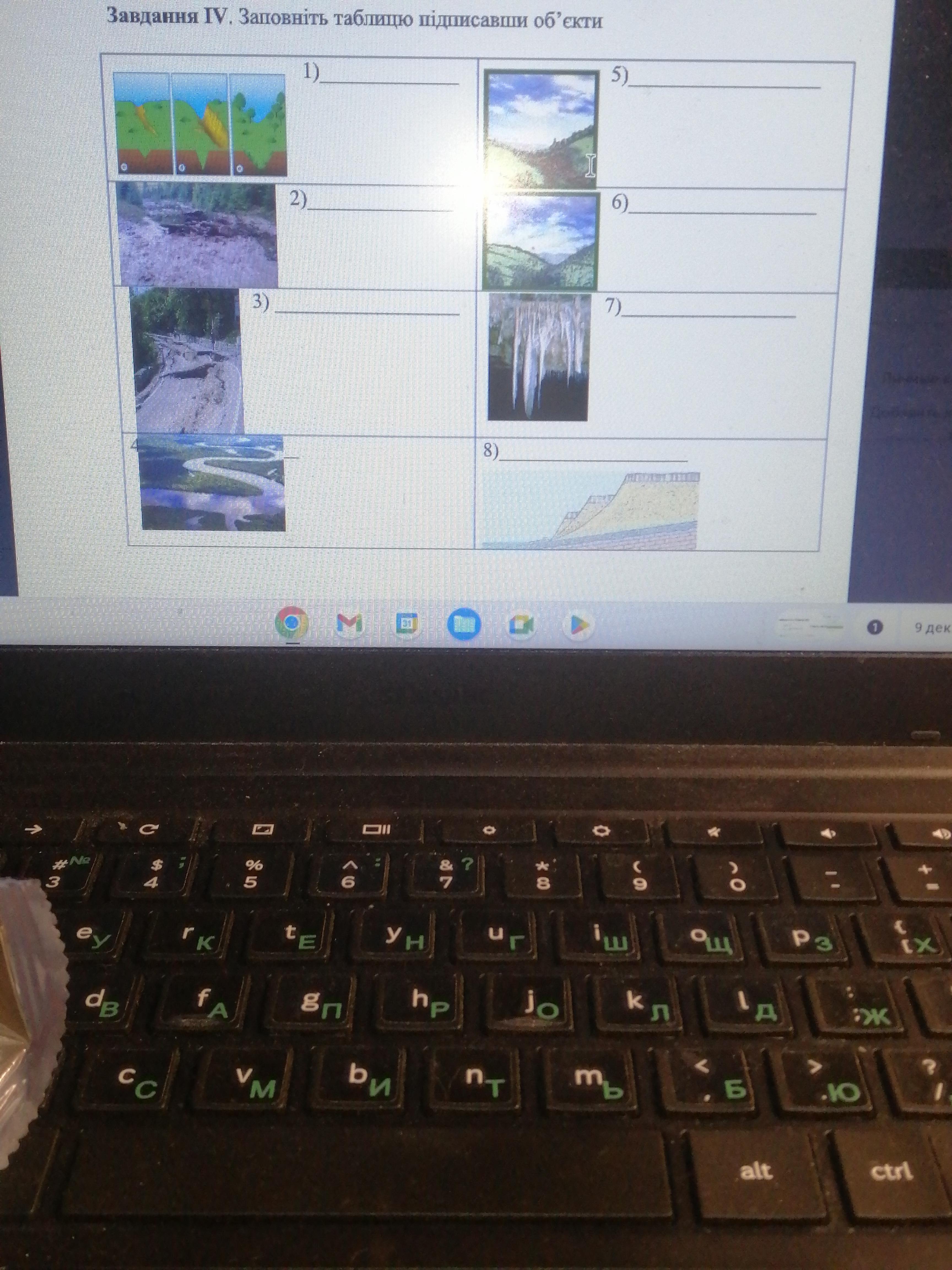 1-яр,2-схоже на болото,3-наслідки землетрусу, або вимивання ґрунту(майбутній яр),4-річка,5,6-не бачу,7-сталактити,8-