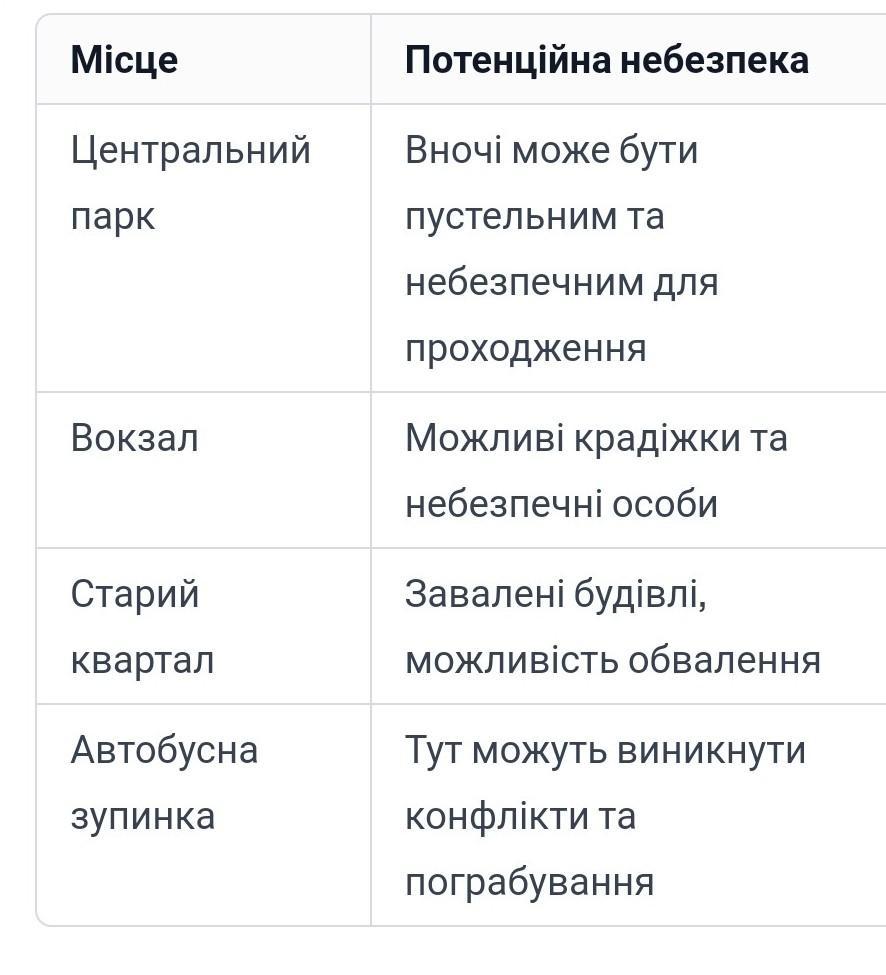 Поміркуй, які місця у твоєму населенному пункті можуть бути небезпечними. Створи і заповни власну таблицю за зразком.