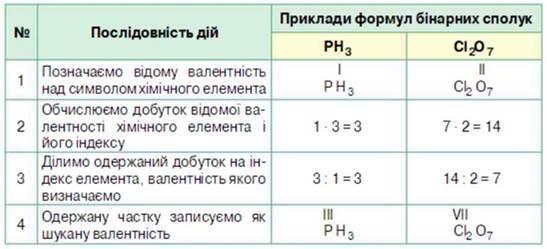 Щоб визначити валентність елемента за формулою бінарної сполуки, необхідно добуток величини валентності й індексу одного елемента поділити на індекс іншого