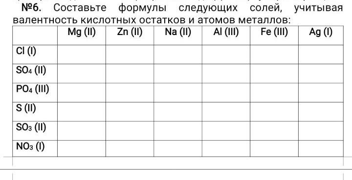 №6. Составьте формулы следующих солей, учитывая валентность кислотных остатков и атомов металлов: Mg (II) Zn (II) Na (II) AI (III) Fe (III) Ag (1) CI (I) SO4 (II) PO4 (III) S (II) SO3 (II) NO3 (1)