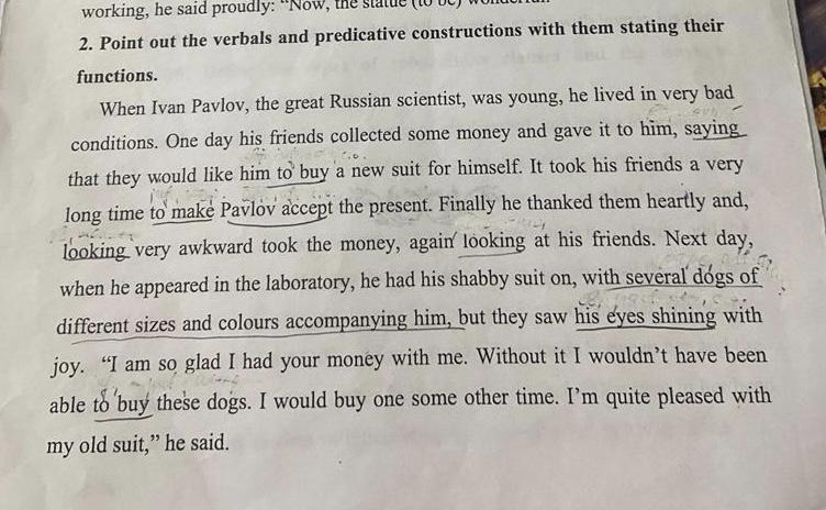7. "I'm quite pleased with my old suit" - predicative construction. "Quite pleased with my old suit" is a predicative complement to the subject "I" and expresses Ivan Pavlov's feelings about his old suit.