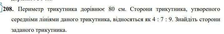 пж дам 10 баллов периметр трикутника дорівнює, 80 см. Сторони трикутника, утвореного середніми лініями трикутника, відносяться як 4:7:9. Знайдіть сторони заданого трикутника.
