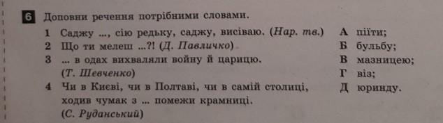 6 Доповни речення потрібними словами. 1 Саджу сiю редьку, саджу, висіваю. (Нар. тв.) Що ти мелеш ...?! (Д. Павличко) 2 3 в одах вихваляли войну й царицю. **** (Т. Шевченко) 4 Чи в Києві, чи в Полтаві, чи в самій столиці, ходив чумак з ... помежи крамниці. (С. Руданський) А пiïти; Б бульбу; В мазницею; Г вiз; д юринду.