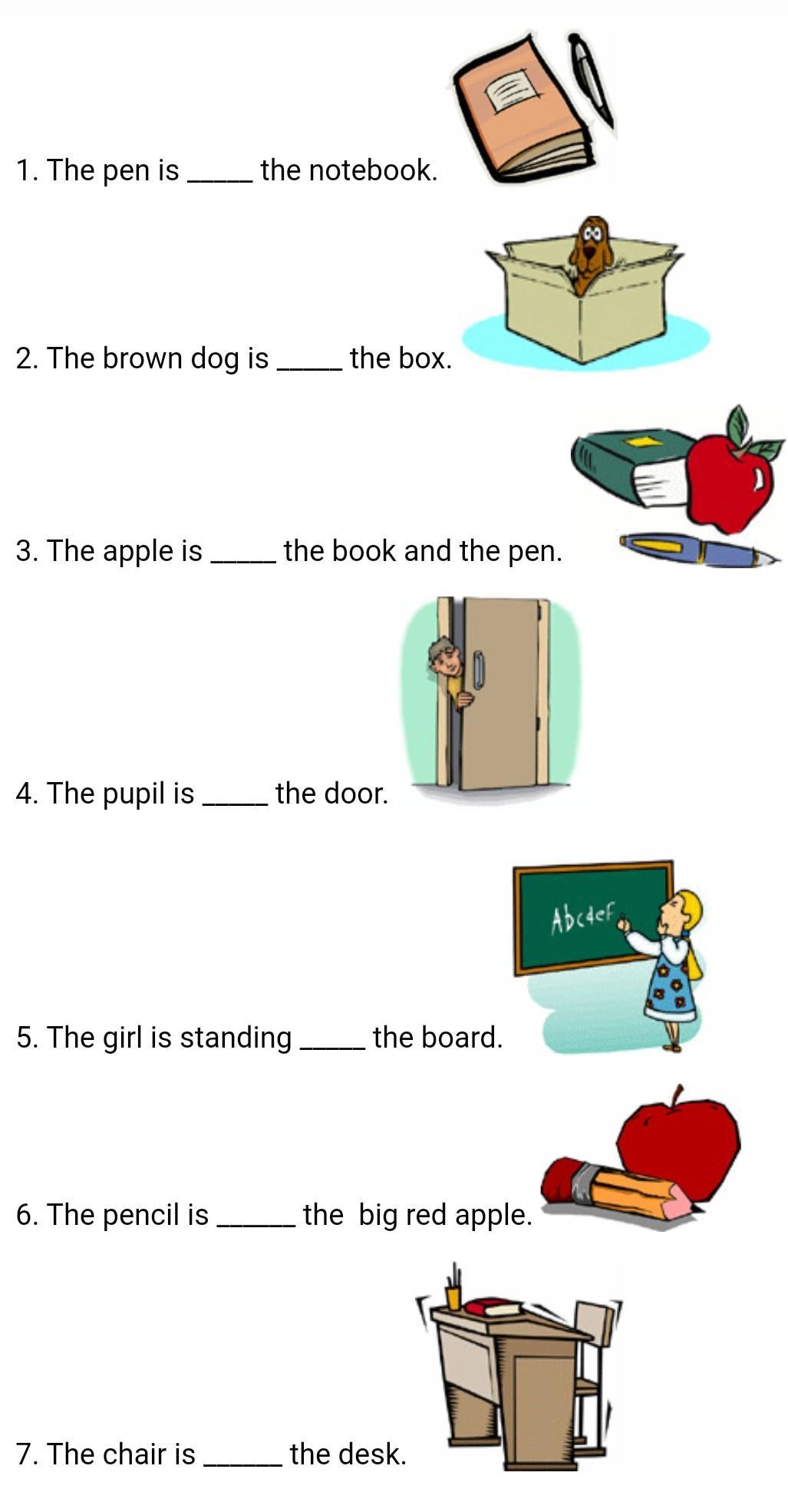 англійська мова 6 клас Вправи з малюнками на закріплення вживання англійських прийменників місця. Кольорові малюнки та речення з пропущеними прийменниками - учні повинні за допомогою малюнків обрати правильний прийменник та заповнити пропуски у реченнях. допоможіть пж