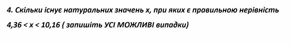 4. Скільки існує натуральних значень х, при яких є правильною нерівність 4,36 < x < 10,16 ( запишіть УСІ МОЖЛИВІ випадки)