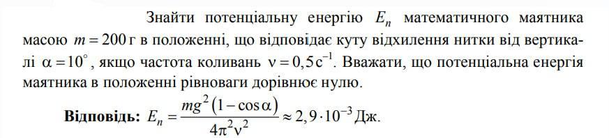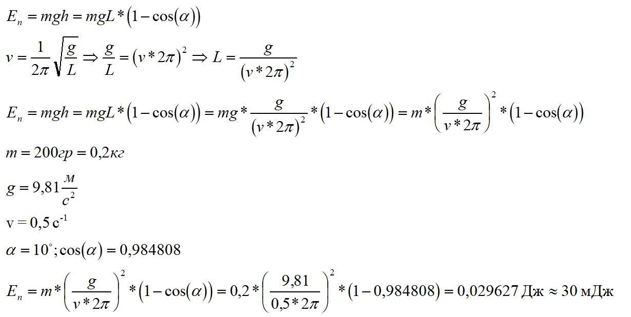 Напишіть розв’язання задачі. Знайти потенціальну енергію Еn математичного маятника масою m = 200 г в положенні, що відповідає куту відхилення нитки від вертикалі a = 10 °