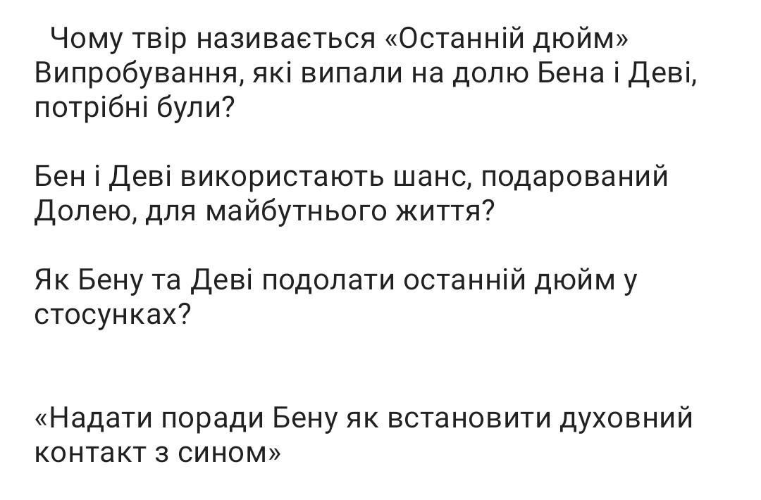 1. Останній дюйм це не тільки міра довжини, яка найважливіша при посадці літака але й відстань, що розділяла батька й сина, а й відстань їхнього непорозуміння. На щастя, Бен і Деві зуміли з честю пройти випробування, що випали на їхгю долю, і не тільки залишились живі,а й подолали отой найважчий останній дюйм, що наблизив їх один до одного.