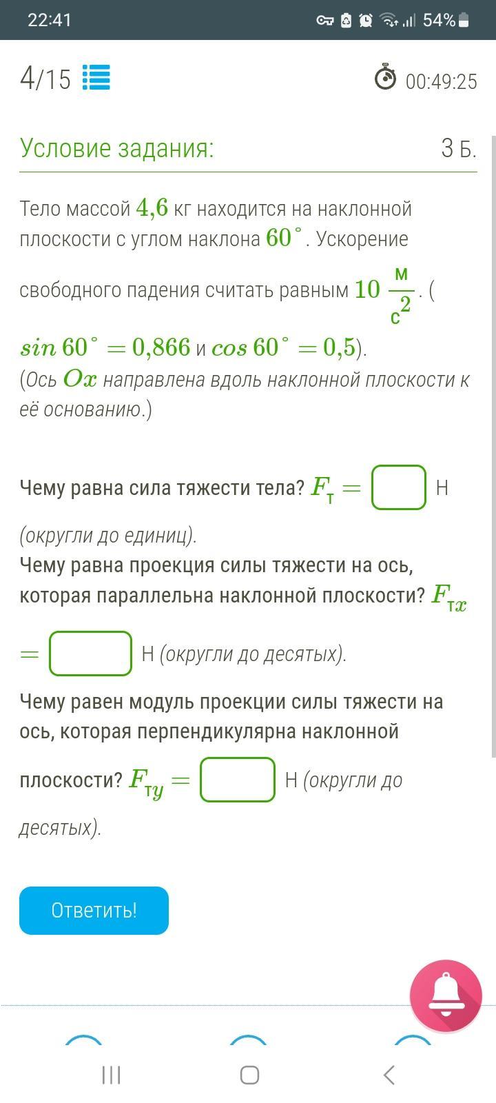 Fтx=m*g*sin60=46*0.866=39.8H